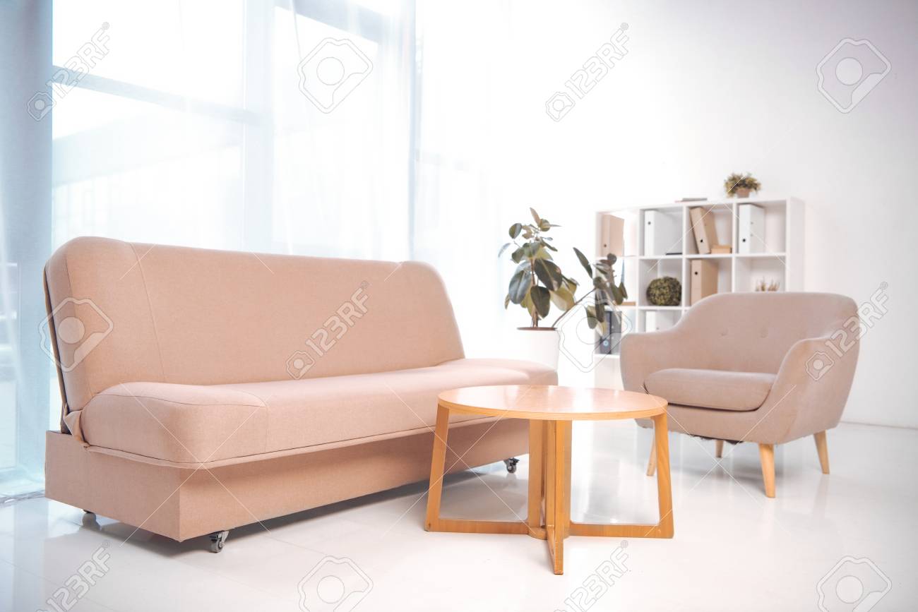 Sofa Armchair Coffee Table And Bookshelf With Folders In Empty Stock Photo Picture And Royalty Free Image Image