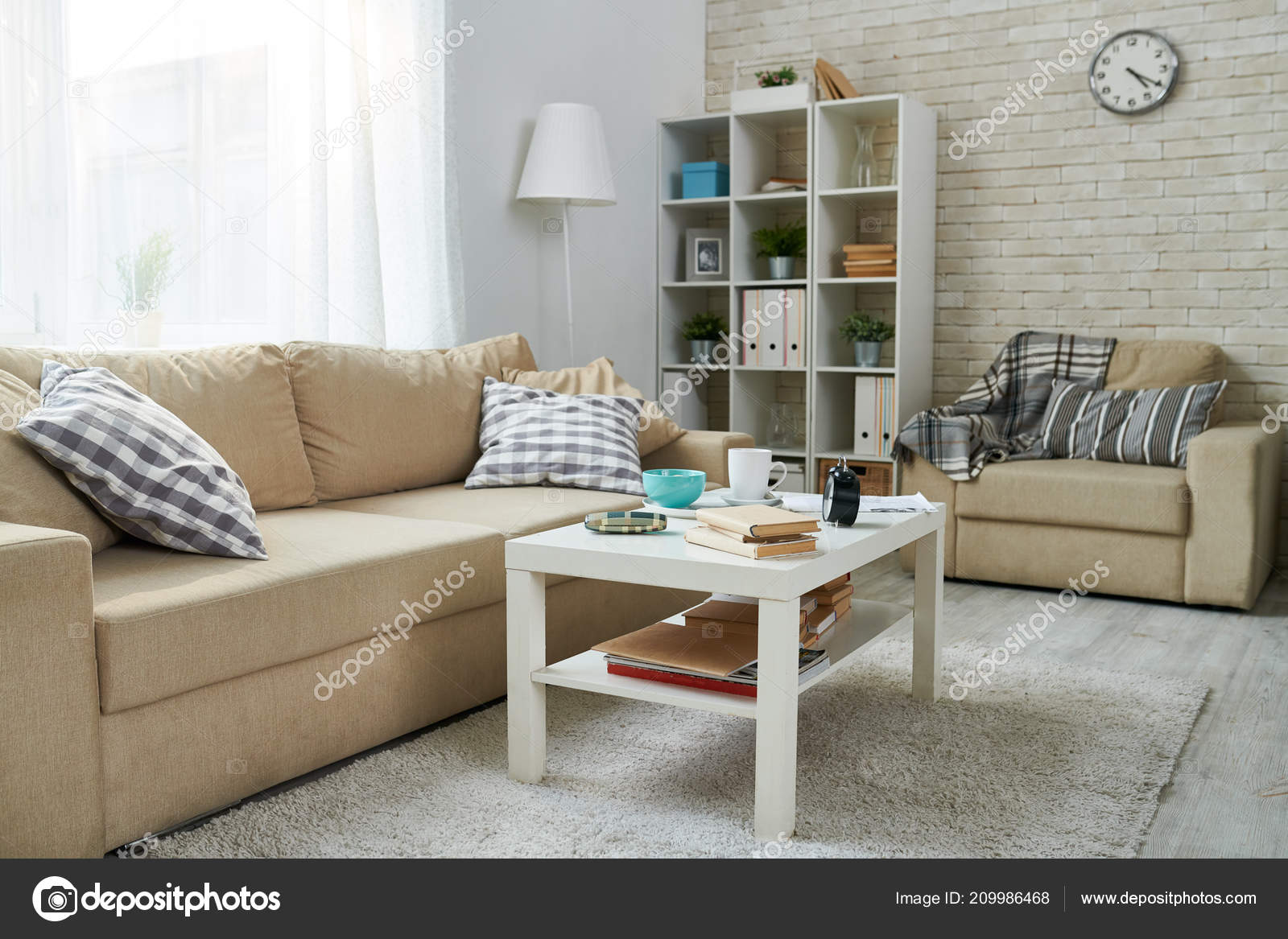 Spacious Living Room Bookshelf Plants Folders Coffee Table Mugs Books Stock Photo C Seventyfour