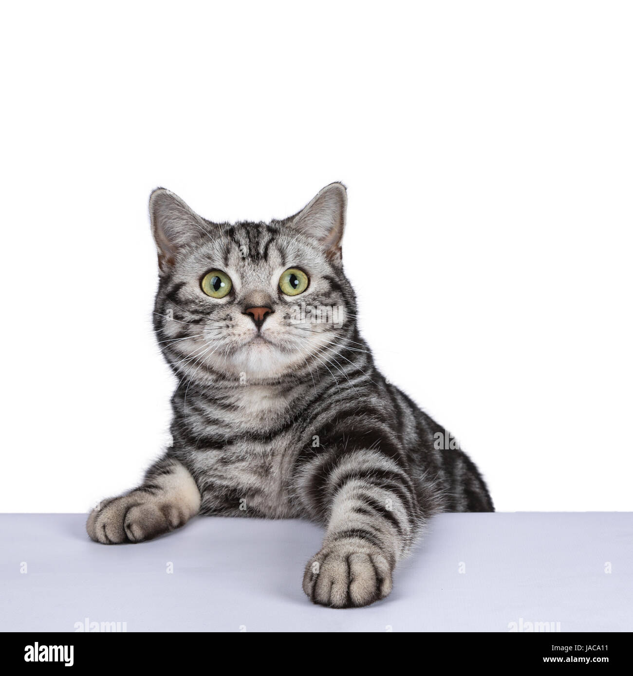 British Shorthair Gato Atigrado Negro Sobre Fondo Blanco Colgando Sobre Gris Metro Mirando Hacia Arriba Fotografia De Stock Alamy