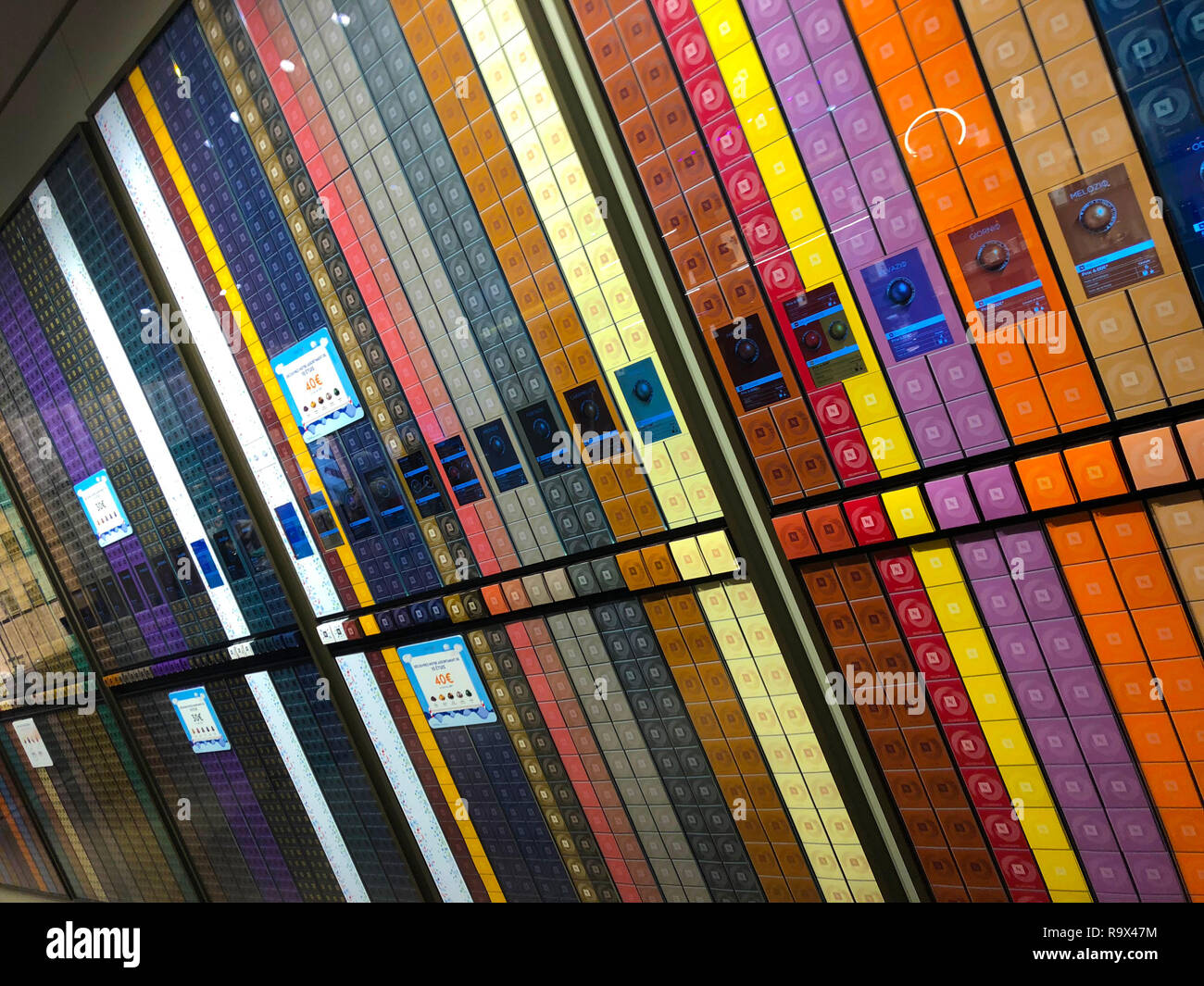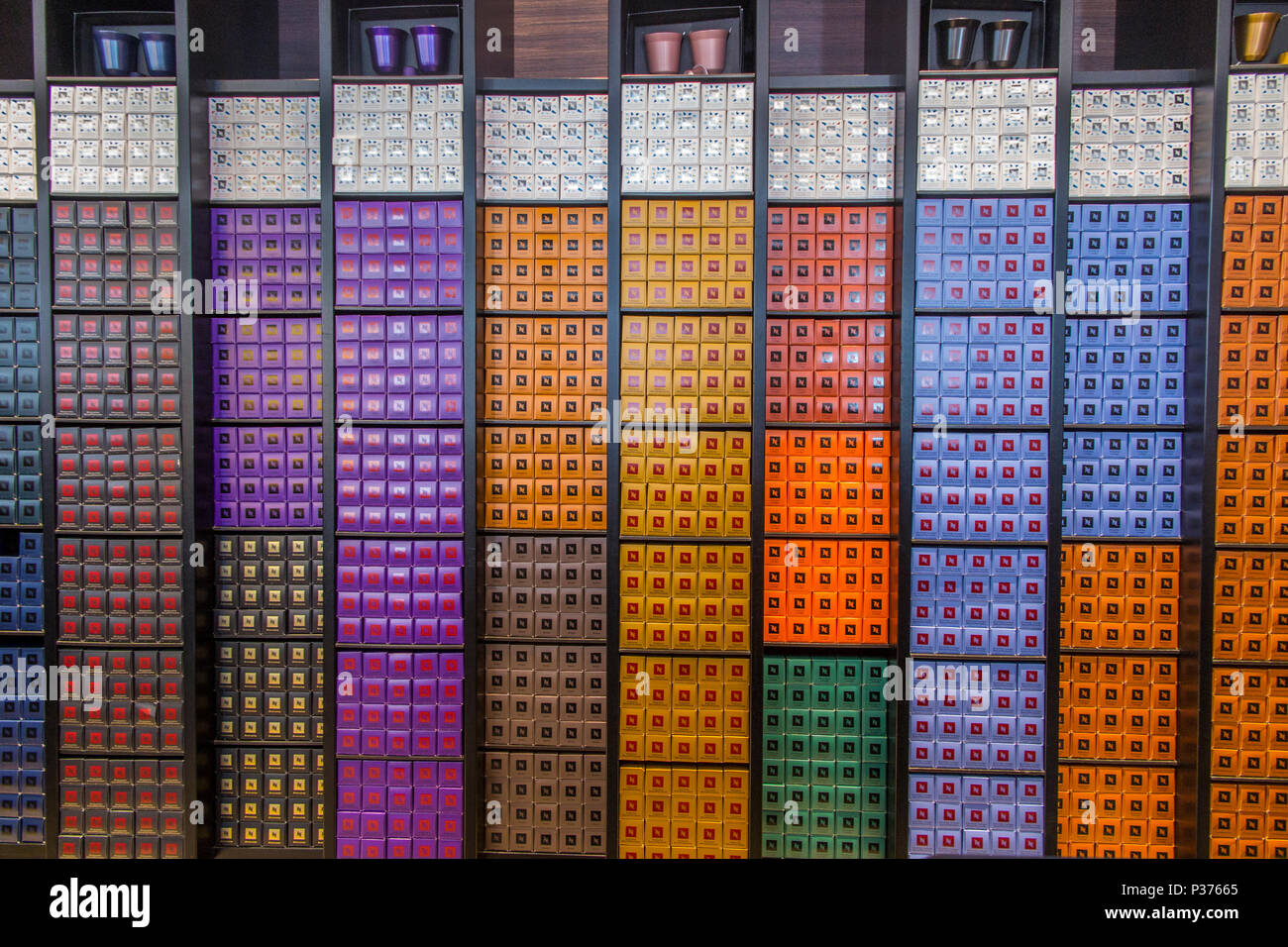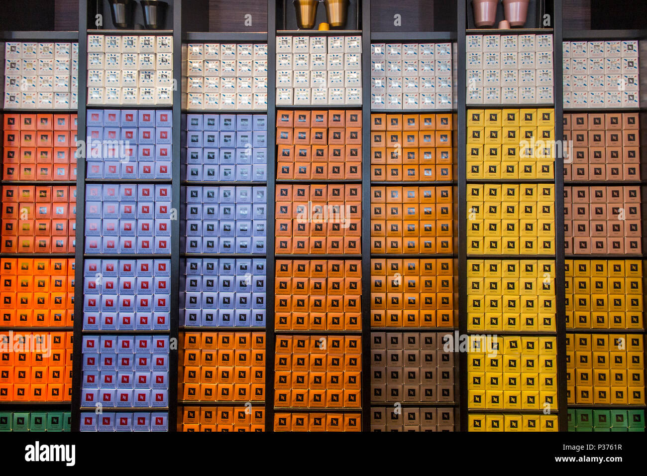 Tiras De Colores Formados Por Los Diferentes Sabores De Capsulas De Cafe Nespresso En Tienda Boutique Fotografia De Stock Alamy