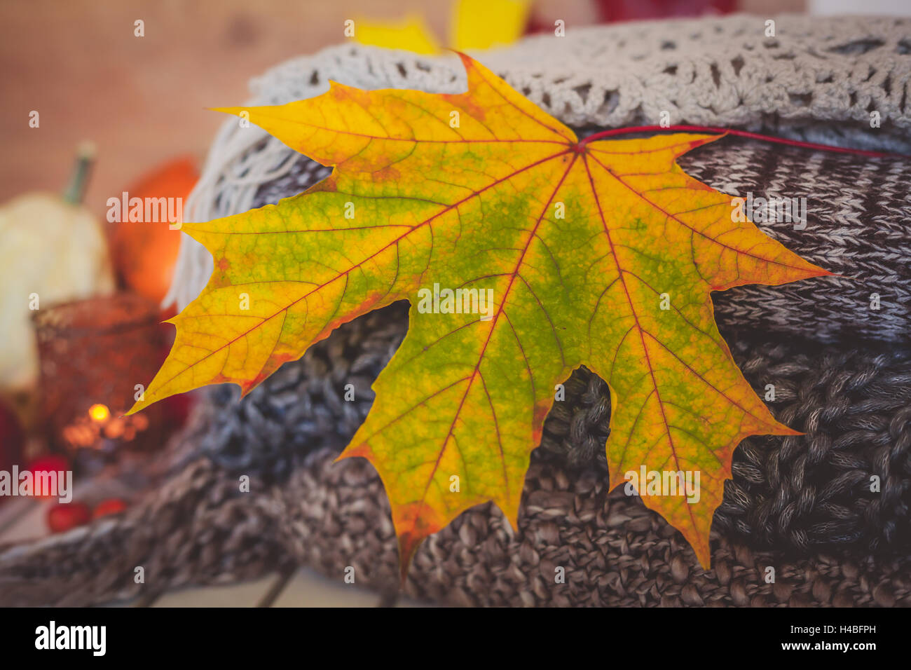 Bodegon Otono Decoracion Con Hojas Secas De Color Amarillo De Lana Bufandas Y Calabazas En La Espalda Fotografia De Stock Alamy