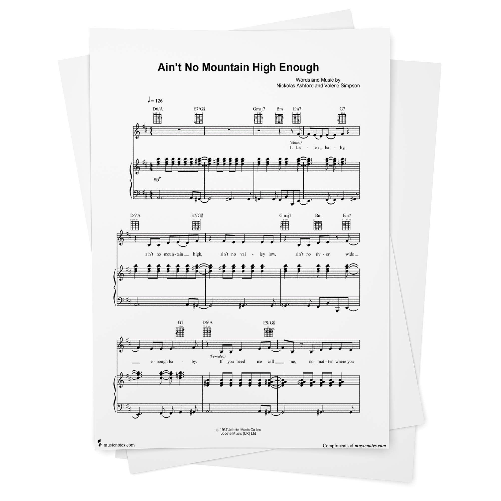 "Ain't No Mountain High Enough" is a pop/soul song written by Nickolas Ashford & Valerie Simpson in 1966 for the Tamla label, a division of Motown The composition was first successful as a 1967 hit single recorded by Marvin Gaye and Tammi Terrell , and became a hit again in 1970 when recorded by former Supremes frontwoman Diana Ross. This is the free "Ain't No Mountain High Enough" sheet music first page Sign up now or log in to get the full version for the best price online" Ain't No Mountain High Enough by Marvin Gaye Product ID OP35 Sheets Product ID HL4781 Similar Piano Sheets Rubber Bullets Away From The Sun Sukiyaki Chiquitita Fernando. Digital Sheet Music for Ain't No Mountain High Enough by , Marvin Gaye, Diana Ross, Michael McDonald, Nickolas Ashford, Valerie Simpson, Tammi Terrell, Phillip Keveren scored for Piano;.