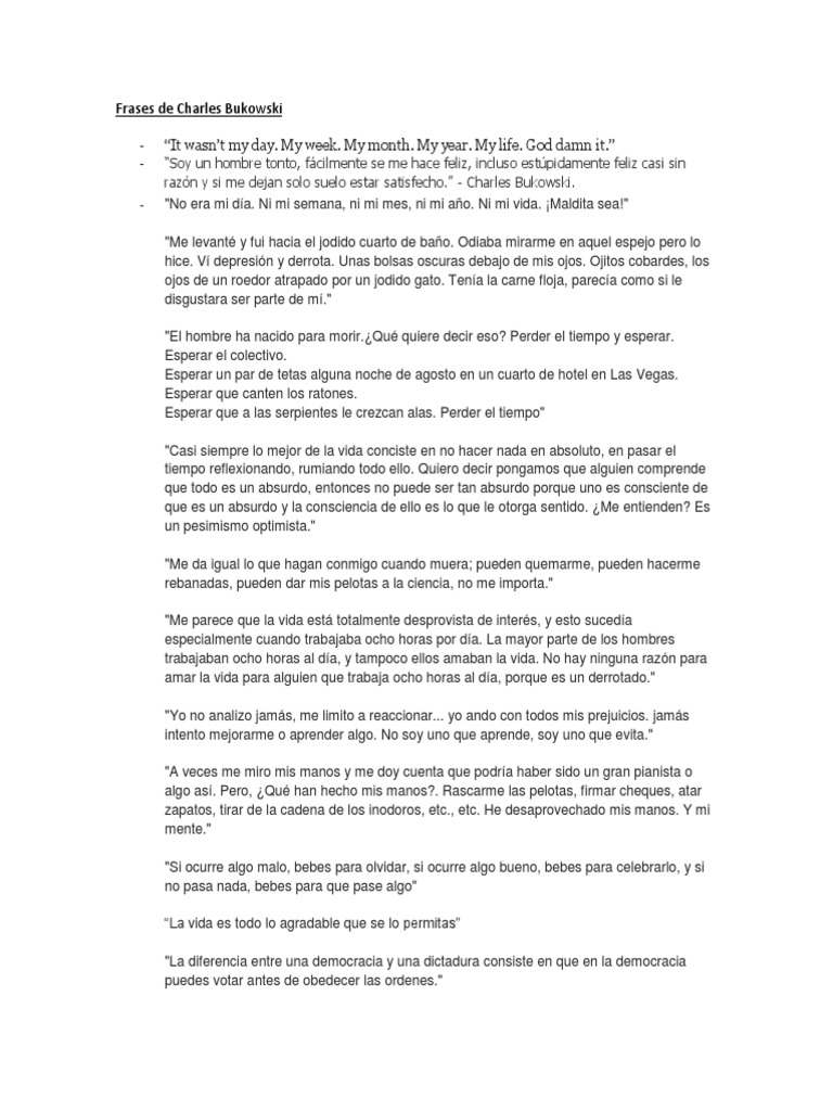 Mujerescharles bukowski SoyErick Humberto PDF Download Free PDF Free PDF Download with Google Download with Facebook or Create a free account to download PDF PDF Download PDF Package PDF Premium PDF Package Download Full PDF Package This paper A short summary of this paper 29 Full PDFs related to this paper. Charles Bukowski (19 1994) fue un relevante escritor y poeta alemán que con tres años de vida emigró a los Estados Unidos, donde se nacionalizó y residió (sobretodo en la ciudad de Los Ángeles) hasta el día de su trágica muerte Este famoso escritor fue el autor de grandes obras tales como “Mujeres”, “Pulp”, “Hollywood”, “Escritos de un viejo indecente” o “Se. 25abr19 Explora el tablero de Walrus Sinclair "Bukowski, Charles" en Ver más ideas sobre bukowski, charles bukowski, escritores.