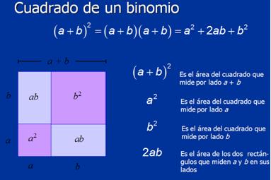 Cuadrado de un binomio El cuadrado de un binomio siempre es un trinomio Sería de utilidad que memorice estos patrones para escribir cuadrados de binomios como trinomios ( a b ) 2 = a 2 2 ab b 2 ( a – b ) 2 = a 2 – 2 ab b 2. Esta actividad pertenece al libro de GeoGebra Ecuaciones y Sistemas Un binomio es una suma o una diferencia de dos números (o expresiones numéricas)Aplicando algunas propiedades básicas de los números, es muy fácil demostrar que "El cuadrado de la suma es la suma de los cuadrados MÁS el doble del producto" "El cuadrado de la diferencia es la suma de los cuadrados MENOS el doble del. (ab) al cuadrado = un binomio al cuadrado Es decir El resultado será siempre El cuadrado del primer termino el doble del producto del primero por el segundo termino el cuadrado del segundo termino Por lo tanto El primer termino es "a" el segundo es "b" siguiendo al regla la respuesta es (ab)^2 = a^2 2ab b^2 Segundo punto.