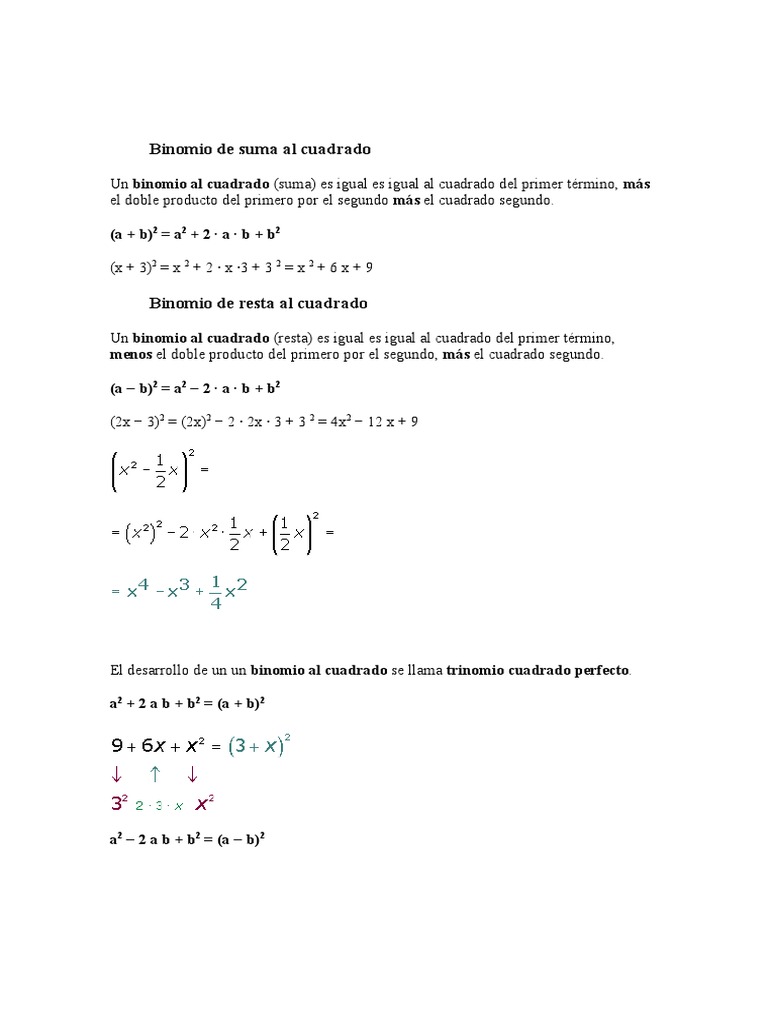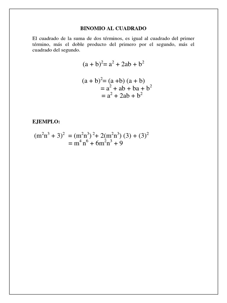 Cuadrado y Cubo de un número 1 El cuadrado Elevar un número al cuadrado es multiplicarlo por sí mismo En un número elevado al cuadrado se pueden distinguir base y exponente La base es el número que se va a multiplicar por sí mismo El exponente es 2 e indica el número de veces que se r. This preview shows page 2 4 out of 4 pages comunes, más el producto de los términos no comunes ( x a)(x b) = x 2 ( a b) x ab Binomio Suma al Cubo El Cubo del Primer Término, más el triple producto del cuadrado del primer por el segundo Término, más el triple producto del primer por el cuadrado del segundo Término, más el cubo del segundo Término. Aplicación de productos notables resuelto aplicando la identidad binomio suma al cuadrado en tres modalidades diferentes Más ejercicios a academiainternet@g.