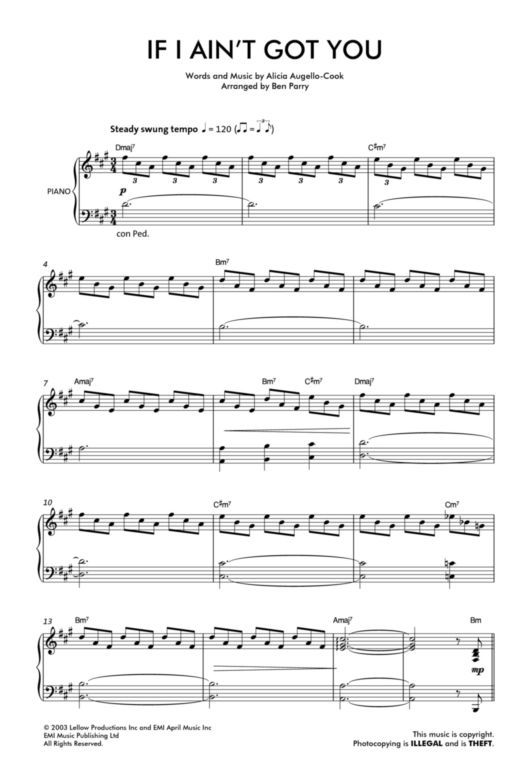 Download and print in PDF or MIDI free sheet music for If I Aint Got You by Alicia Keys arranged by Jst_music for Piano, Violin (Solo). In order to check if 'If I Ain't Got You' can be transposed to various keys, check "notes" icon at the bottom of viewer as shown in the picture below Simply click the icon and if further key options appear then apperantly this sheet music is transposable. Basically, if you take the first chord and move each note down the G Major scale four times you’ll have it – Cmaj7, Bmin7, Amin7 and Gmaj7 Anyway, if that’s the type of thing you’re interested in, then check out our key signature essentials package to learn more about the harmonic functions used in this song.