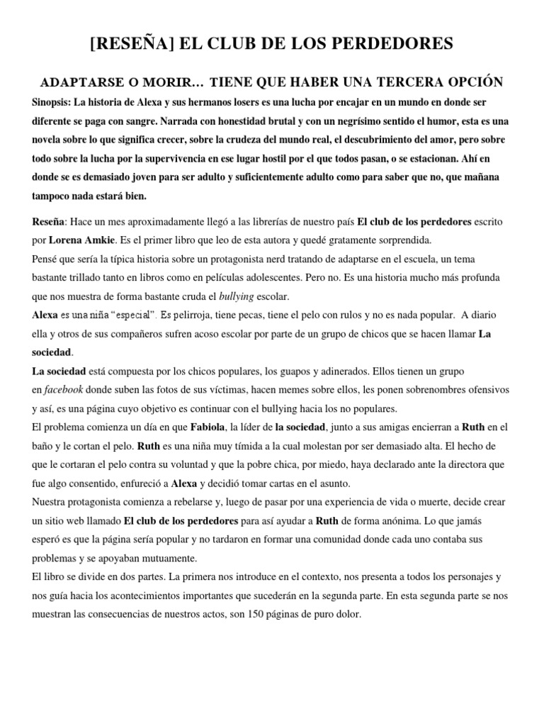 Descargar libro EL CLUB DE LOS PERDEDORES (EDICIÓN ESPAÑOLA) EBOOK del autor LORENA AMKIE (ISBN ) en PDF o EPUB completo al MEJOR PRECIO, leer online gratis la sinopsis o resumen, opiniones, críticas y comentarios. #libros #el club de los perdedores 254 notes uniquestyles Follow X no podes llorar tanto con una escena La escena. 6 reseñas sobre el libro EL CLUB DE LOS PERDEDORES Juan Carlos Malik Un libro que me hizo sentir cosas que yo antes había creído olvidadas Lorena muestra lo mas terrorífico y cruel de la vida, LOS HUMANOS Y SUS ACTITUDES Y muestra además como los seres diferentes o raros, terminan siendo las victimas de una sociedad disque normal.