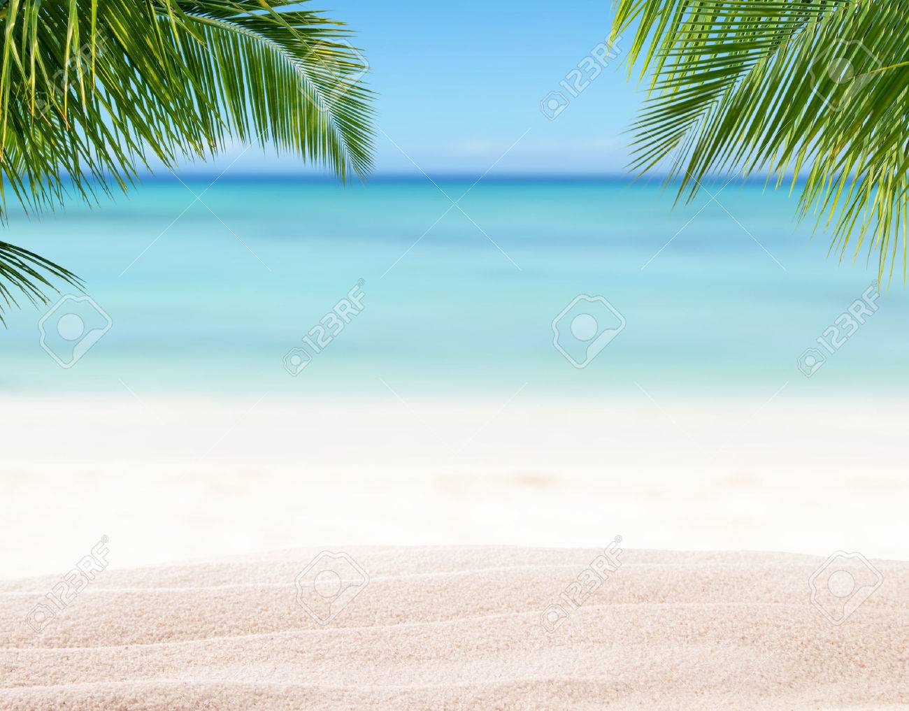 Playa De Arena De Verano Con La Falta De Definicion Del Oceano En El Fondo Hojas De Palmera En Primer Plano Fotos Retratos Imagenes Y Fotografia De Archivo Libres De Derecho Image