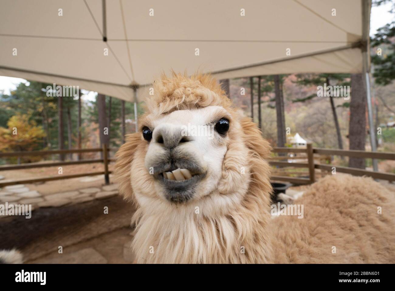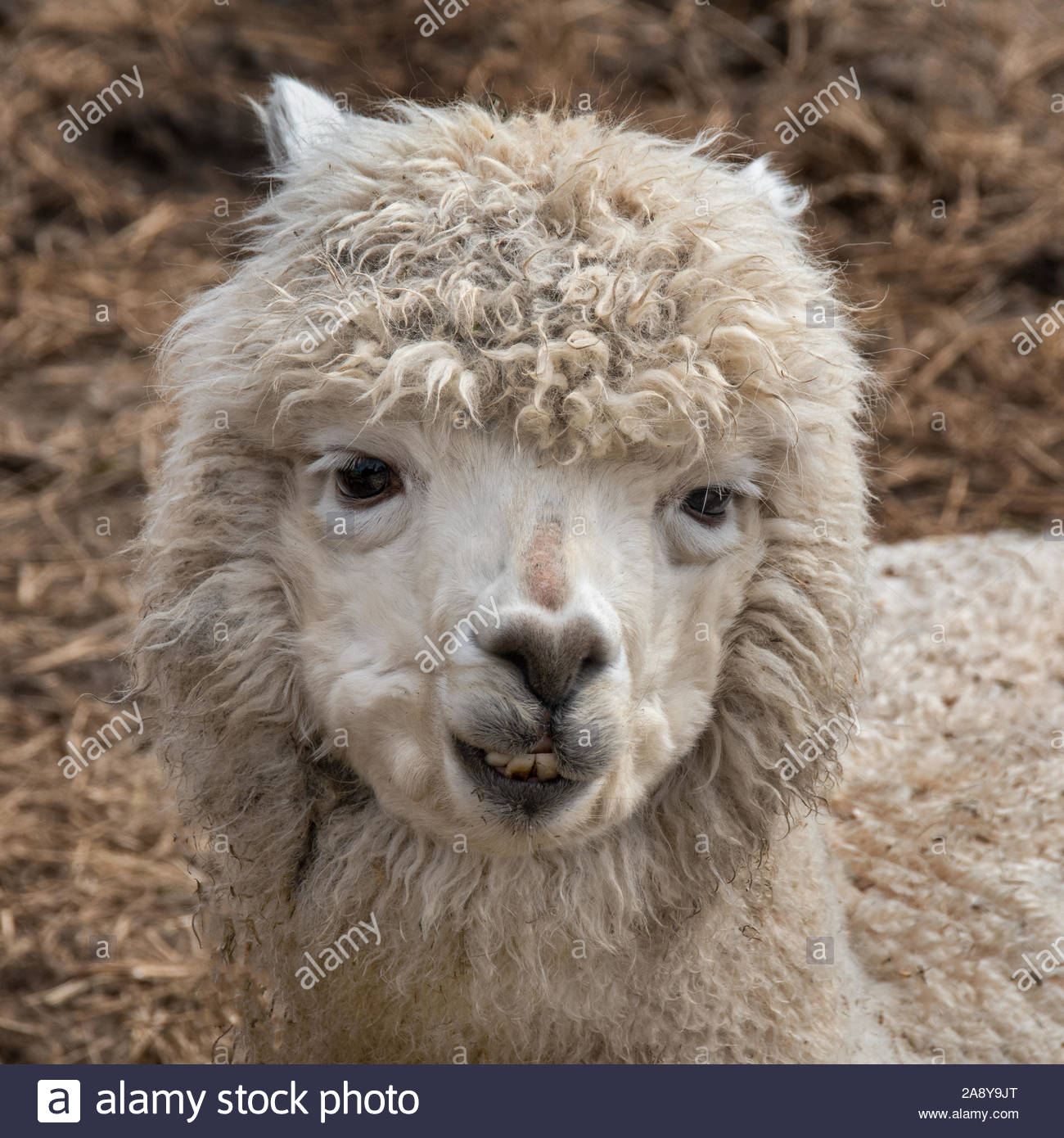 Cute Expression Of White Alpaca Close Up Face Of Llama Showing Its Teeth At The Farm Stock Photo Alamy