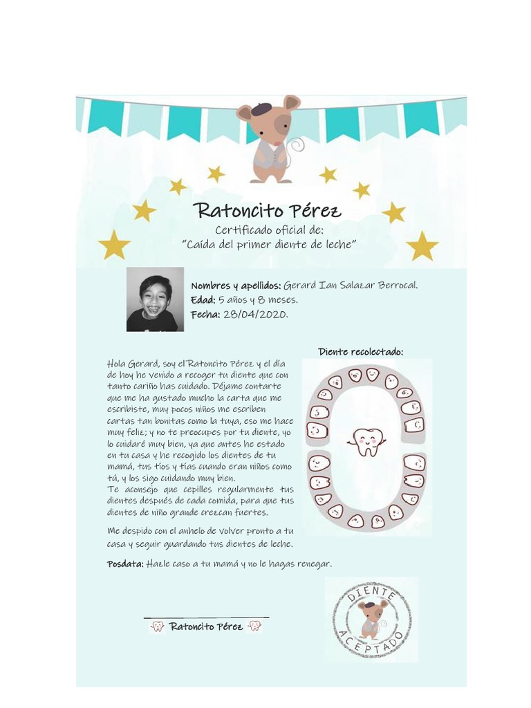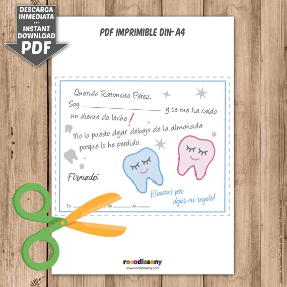 Certificado Raton Perez, Certificado ratoncito perez, Certificado caída diente, Diploma ratoncito perez Add to Favorites Click to zoom NATULANUDOS 12 sales 12 Digital file type(s) 1 PDF Description Translated by Microsoft See in original language. El Ratoncito Pérez or Ratón Pérez (literally translated into English as Perez mouse or Perez the Mouse) is a figure popular in Spanish and Hispanic American cultures, similar to the tooth fairy, originating in Madrid in 14 As is traditional in some Englishspeaking countries, when a child loses a tooth it is customary for him or her to place it under the pillow, so that Ratoncito Pérez. Carta del Ratoncito Perez También te ofrecemos el PDF de la carta del Ratoncito Perez para imprimir Más que una carta es más bien un certificado de entrega del diente de leche que entrega el Ratoncito Perez al niño e indica el nombre del niño, la fecha de entrega del diente, la posición y el estado.