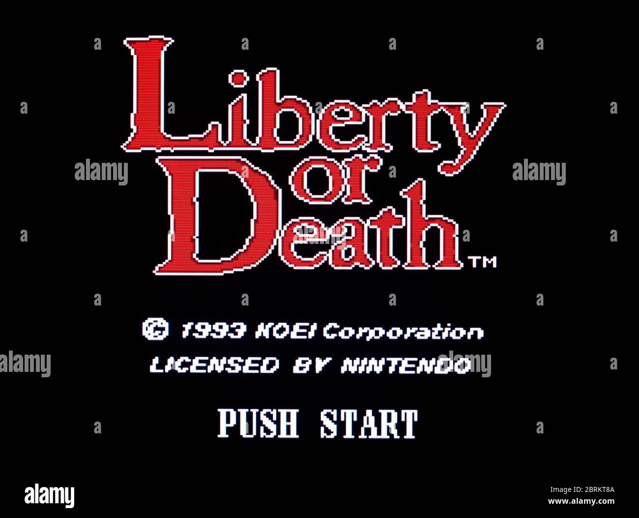 Liberty or Death SNES Super Nintendo Game Cartridge Cleaned Tested and Guaranteed to Work!. Liberty or Death Nintendo Super NES by Koei Write a review How are ratings calculated?. Liberty or Death is a turnbased strategy video game for NEC PC9801, MSDOS, Super NES and Sega Genesis released by Koei in 1993 Liberty or Death is part of Koei's Historical Simulation Series Liberty or Death MSDOS cover art DeveloperKoei PublisherKoei DesignerStieg Hedlund PlatformNEC PC9801, MSDOS, Super NES, Sega Genesis ReleasePC9801 JP September 27, 1993 DOS NA 1993 Super NES JP March 18, 1994 NA 1994 Genesis NA 1994 GenreTurnbased strategy ModeSingleplayer Multiplayer Zerop.