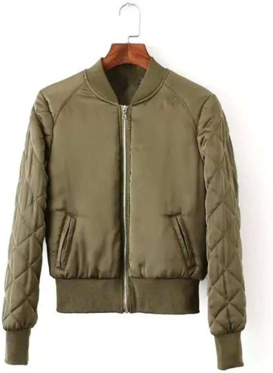 Women S Bomber Jacket Army Green Quilted Front Zippered Chest Pocket