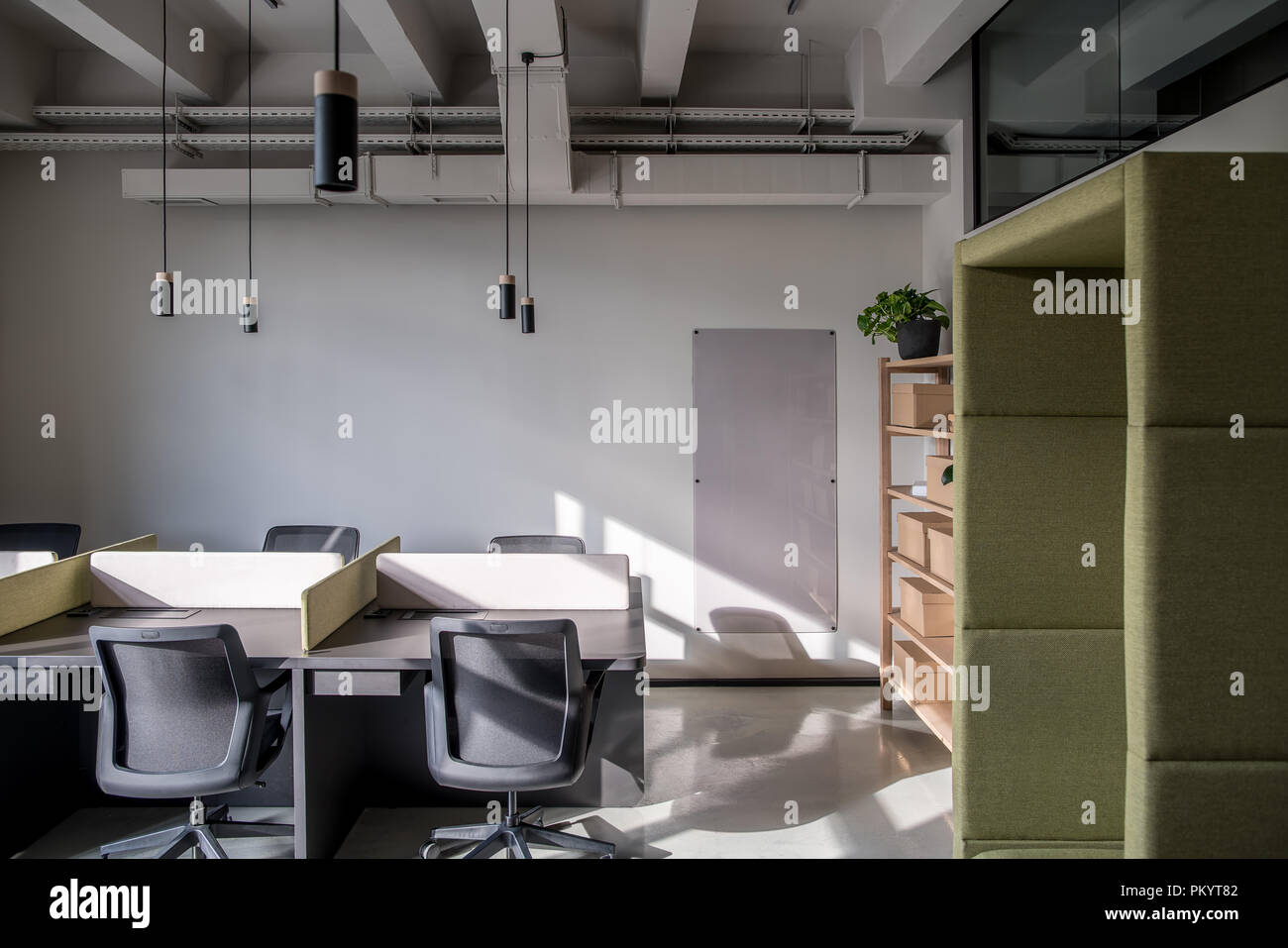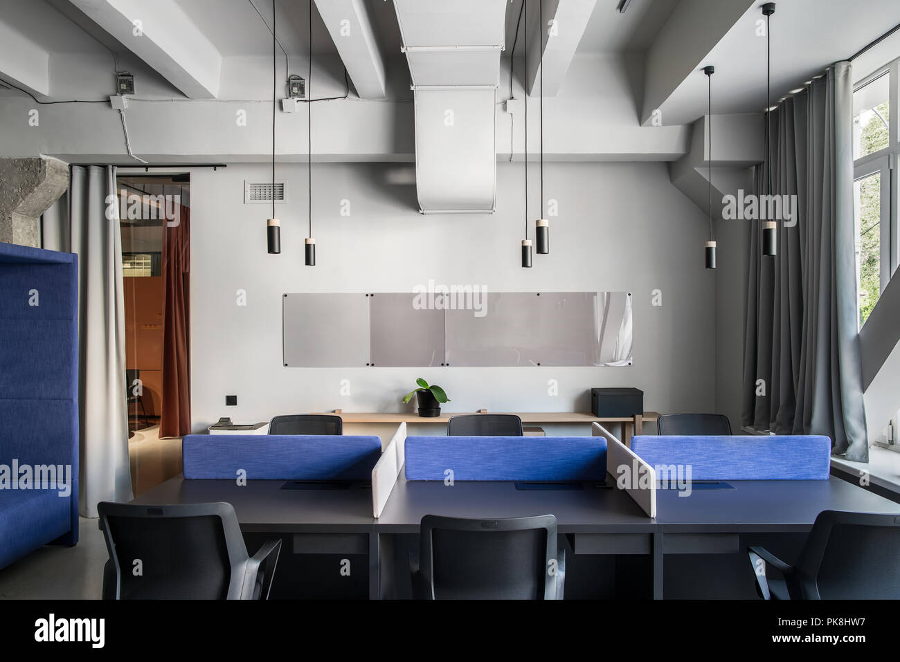 Coworking Agradable En Un Estilo Loft Con Paredes Grises Existen Tablas Con Particiones Negro Oscuro Sillas Estanterias De Madera Con Cuadros Y Plantas Placas Bfn Fotografia De Stock Alamy