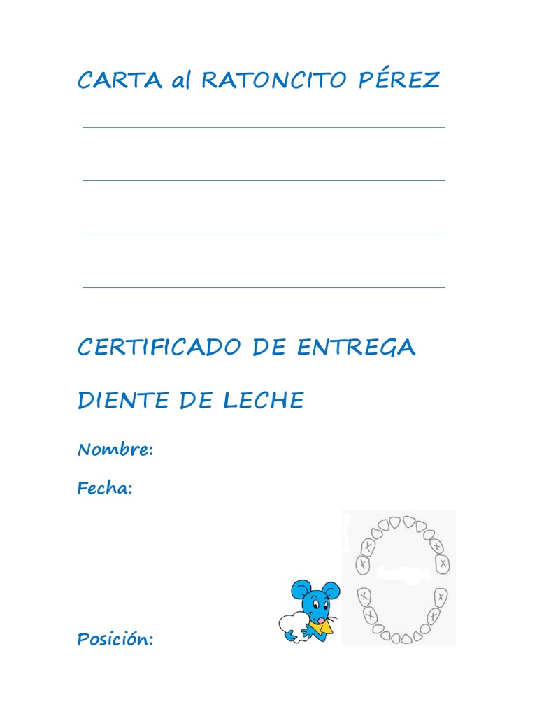 Una nota del Ratoncito Pérez para imprimir gratis No te pierdas esta carta del Ratoncito Pérez un certificado imprimible que prueba que entregó el diente. Certificados y cartas del Ratoncito Pérez para imprimir Una madre en el dentista Descarga los certificados y cartas del Ratoncito Pérez que encontrarás en este artículoDiferentes modelos para rellenar con el niño y hacerlo más divertido Salvador Rico GDentista. Se trata de un certificado pero no cualquier certificado sino uno donde consta que el Ratoncito Peréz ha recogido nuestro diente Allí podréis incluir el nombre del niño, la fecha en que se cayó el diente, marcar de qué diente se trataba, qué recompensa dejé el ratoncito a cambio y lo más importante ¡en qué estado se lleva el diente!.