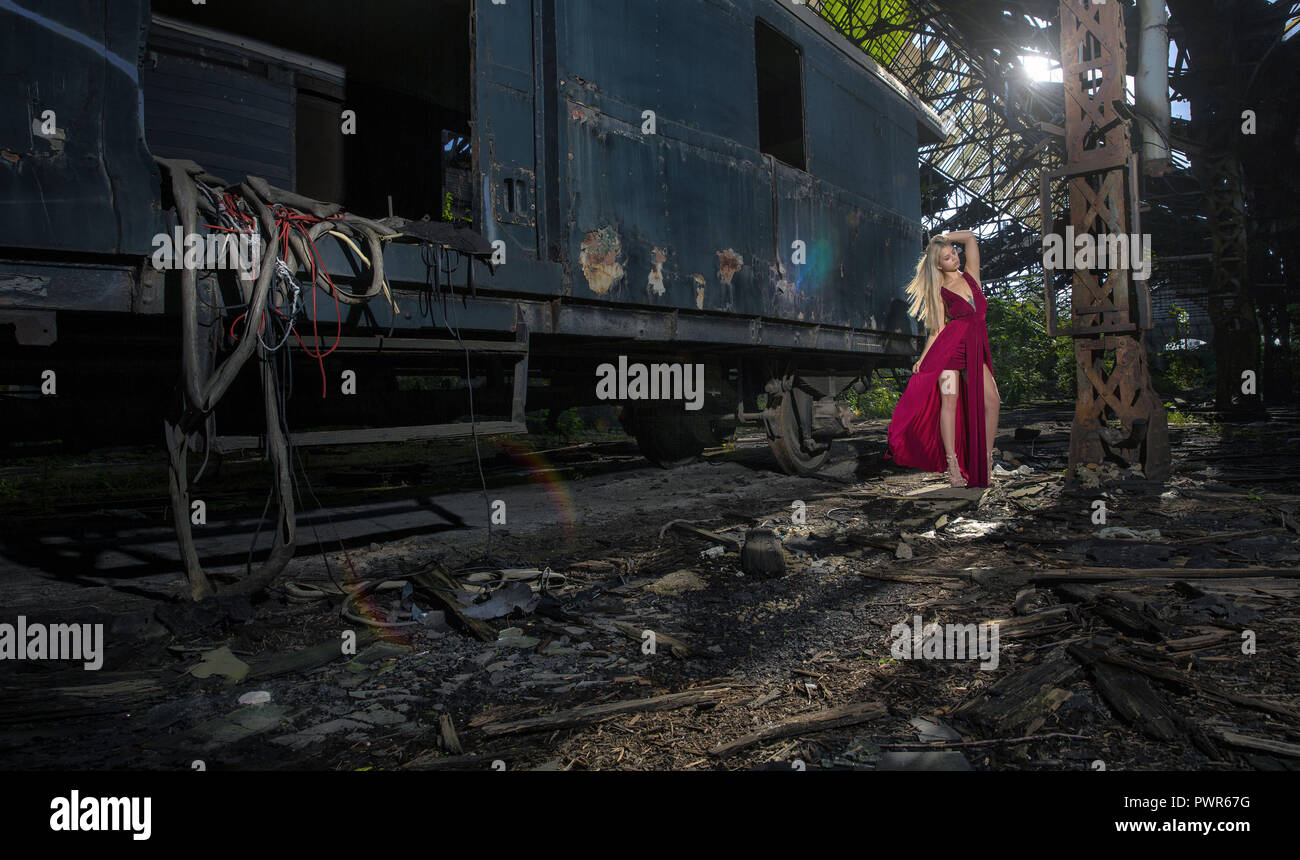 Bella Mujer En La Estacion De Tren Abandonada De Vestido Rojo Fotografia De Stock Alamy