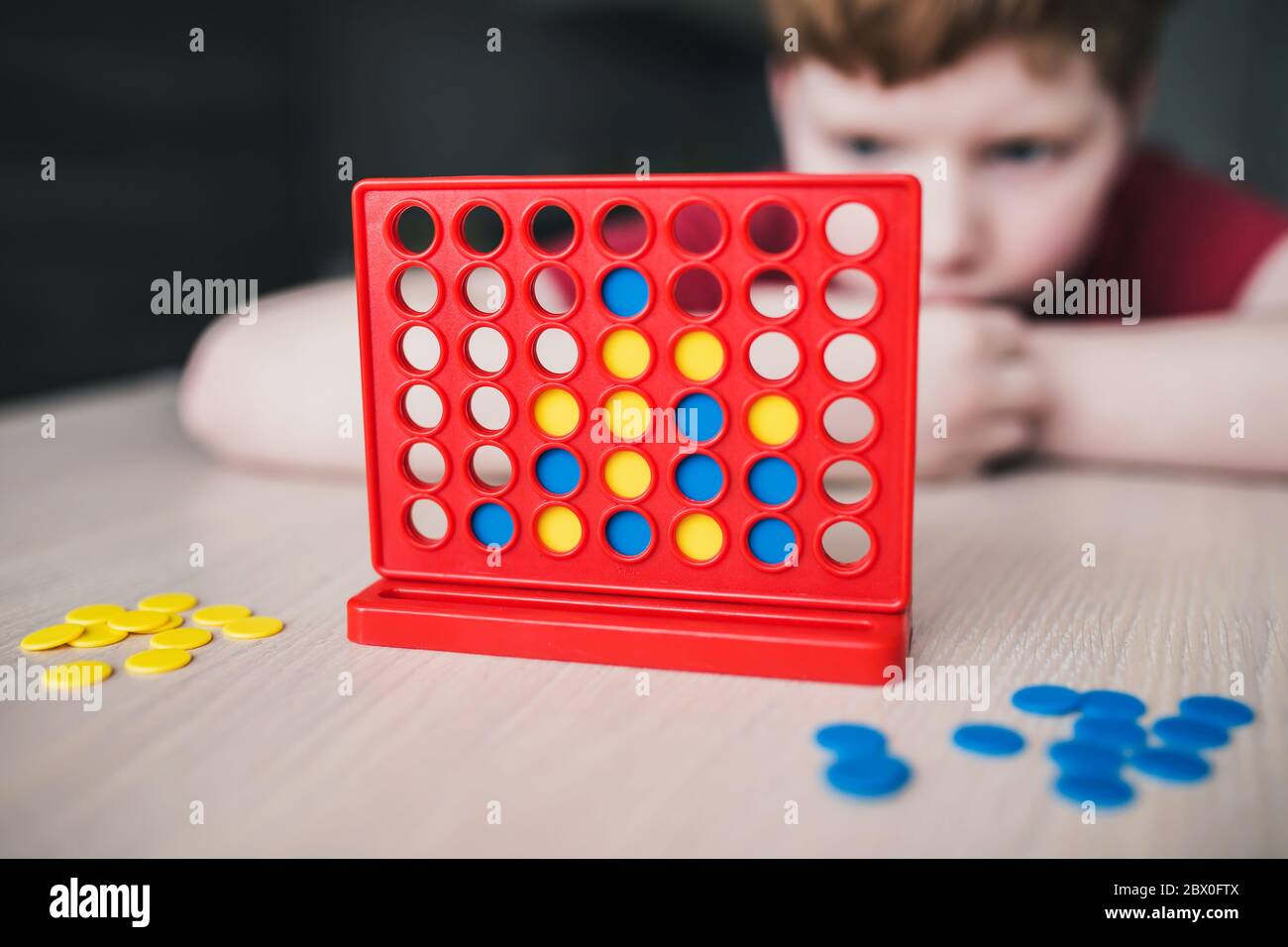 The Child Is Thinking About Strategy In A Board Game Pick Four In A Row Stock Photo Alamy