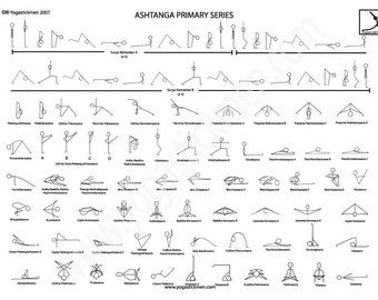Ashtanga Yoga Primary Series or Primary Series of Ashtanga Yoga Ashtanga Yoga is the yoga of ashta (eight) anga (limbs), and is the practice of yama, niyama, asana, pranayama, pratyahara, dharana, dhyana, and smadhi This style is a dynamic vinyasa flow that connects the movement of the body with the breath This style has six series with each having certain number of poses to be practiced, in. 24"x36" Ashtanga Yoga Primary Series Poster in digital printable PDF format This Beautiful poster contains all of the yoga poses in the Ashtanga Primary Series with their Sanskrit Names and their English names. Primary Series Practice Sheet We’re happy to share this practice sheet with the ashtanga yoga community Feel free to download the JPG files by clicking on the images above or download a high resolution PDF via this link , and use this sheet as a resource while learning the primary series.