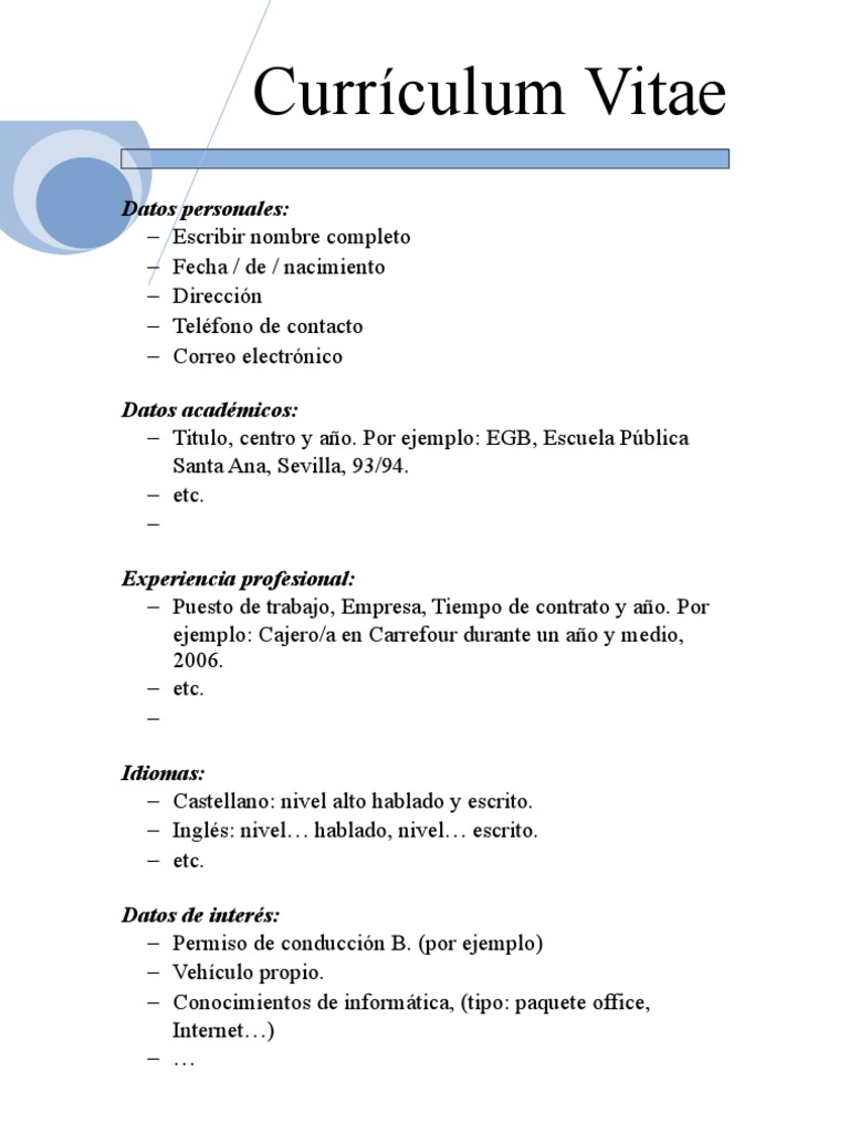 Vamos a ver cómo hacer un curriculum vitae básico y sencillo que pueda adaptarse para solicitar cualquier tipo de empleo También tienes a tu disposición varias plantillas muy fáciles de editar, así que podrás descargar el curriculum vitae básico para rellenar que más te guste, ya que todos son gratis Si quieres un currículum simple, estás en el lugar adecuado!. The curriculum vitae is a living document, which will reflect the developments in a scholar/teacher's career, and thus should be updated frequently How is a CV different from a resume?. Por ello debes aprender a redactarlo y mantenerlo actualizadoEn este artículo te contamos la información esencial que debe presentar tu hoja de vida ¿Qué es un curriculum vitae?.
