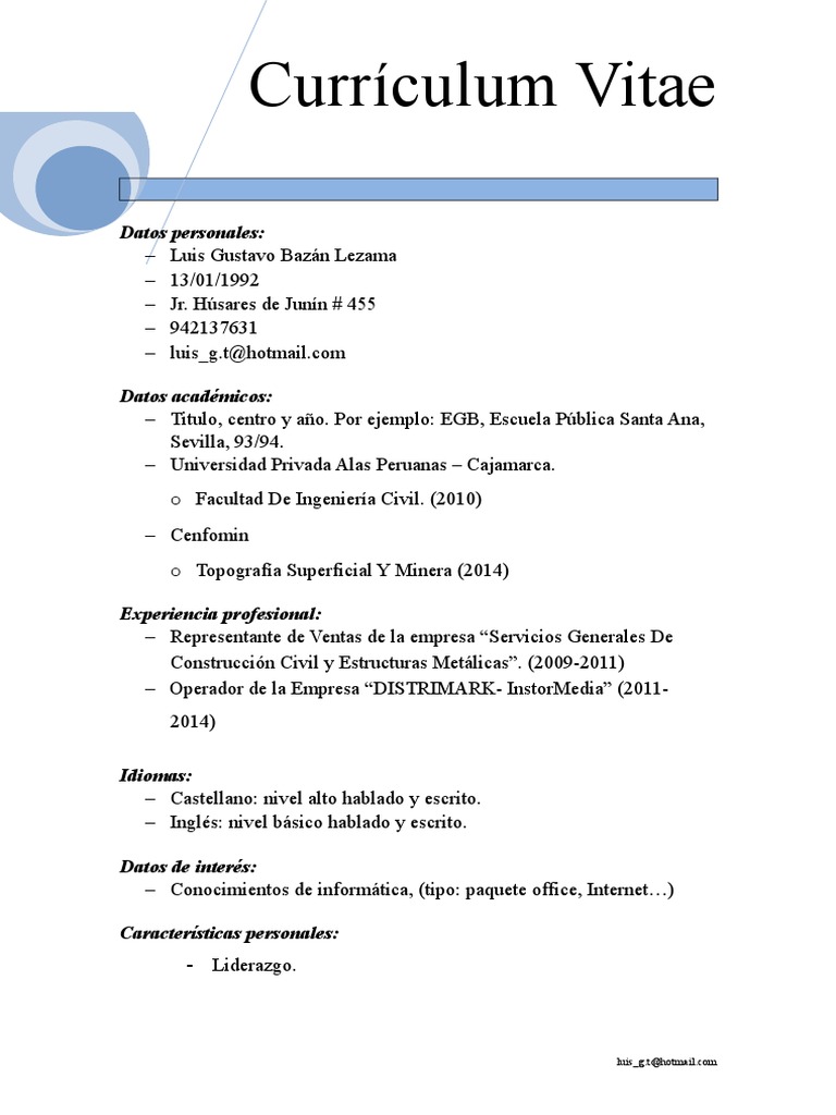 Îû 5µÿzÜT7˜“Ð>!Hän“ñ ;ñ ;ñ³lÏì Ip@‚ ² ÊW´¿ZSþuGU÷þÞ–eäª 3 !PåtŒ‘C'‰êÁÿöïž‘TnI«ª éHk’t$í. The most noticeable difference between most CVs and most resumes is the length Entry level resumes are usually limited to a page. Pero ser sencillo no implica ser falto de interés e interés es lo que queremos despertar en quien tiene la oportunidad de conocer nuestro curriculum vitae y darnos una entrevista de trabajo, que nos permita informar personalmente de nuestras experiencias y demás requerimientos del puesto.