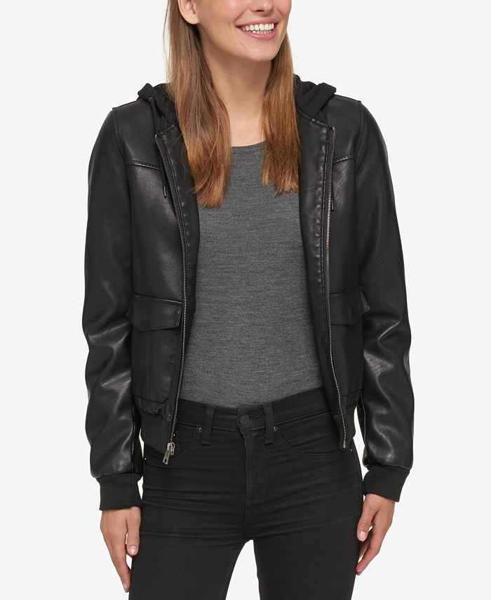Levi S Two Pocket Faux Leather Hooded Bomber Jacket At Amazon Women S Coats Shop