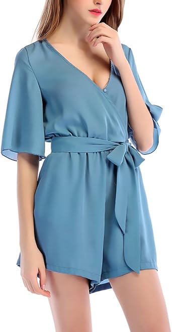 Monos De Vestir Mujer Fiesta Chiffon Monos Cortos Con Cinturon Manga Corta V Cuello Anchos Ropa Jumpsuits For Women Colores Solidos Playa Moda Amazon Es Ropa Y Accesorios
